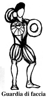 „It is said that the Guardia di faccia is positioned with the arm straight and the right side (read „the palm“) of the hand is upward and the true edge looking to the left side and the point, together with the right flank, must point at the enemy's face: this guard is so called because it looks very well to the face“.