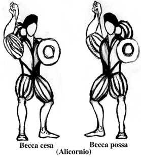 The etymology of these two guards is not clear: the „becca“ was a kind of baldric used by the medieval knights; the adjective „cesa“ could derive from the latin „caesa“ (past participe of „caedere“) that would mean „killed“, „defeated“, and „possa“ as derivation of „possum“, „to be able“, „to be powerful“; then, seeing that in this guard the blade crosses the figure obliquely, there can be a „baldric“ (becca) „strong“ (possa) or „weak“ (cesa), with the left foot forward in the first case and with the right in the second.