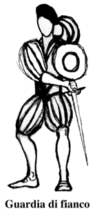 This guard is mentioned just one time by Marozzo when using a rapier and then in the case of swords bout („I want you to open to your enemy your left leg and if he'll attack there with a mandritto you'll parry with the false edge of your left sword, raising up your hand in Flank guard“ ch. 78): following the description the parry is executed with the false edge of the left sword with the hand upward and the point downward, to cover the low left target.