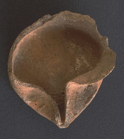 1500-600 př. n. l. - ručně tvarovaná talířová lampa, Kanaán, Palestina. Podoba s mušlí je očividná. Zdroj: www.ancientlamps.com |