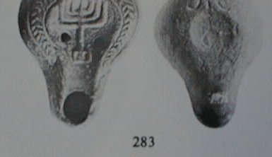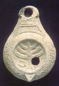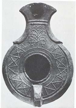 300-500 n. l. nález z Golgoty má po stranách vinné hrozny, nahoře sedmiramenný svícen. Zdroj: www.ancientlamps.com |