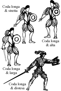 At Ch. 138 Marozzo explains: „You'll set your student with the right leg forward with his sword and buckler well straight versus his enemy and make that his right hand be outside by his right knee, with his right wrist toward the ground, as you see in the picture: and this is called Coda longa & stretta“; but Dall'Agocchie more clearly says: „Coda lunga will be when the sword is held outside the right side: Coda longa e stretta when the right foot is forward and Coda longa e alta when the left foot is forward, always keeping the sword out of the right side with the arm well straight and the point versus the enemy. This guard is so called as a similitude with important persons that are always surrounded by a lot of people and for popular proverb it's used to say „Beware to they that have the long tail“. And the same for this guard cause it gets the long tail. (…) I told before that the Coda longa is a guard of three kind: the first it's Coda lunga e stretta with the right foot forward, alta with the left; the second is when being in Coda longa e stretta withdrawing the armed hand and putting the point toward the ground and it's named Coda longa e larga. Third when, being in Coda longa e larga, the point of the sword is put backward and it's called Coda longa e distesa. Coda longa e larga and Coda longa e distesa can be made both with the right or the left foot forward“.