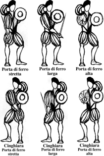 As it is explaned by Dall'Agocchie, this guard „is said Porta di ferro like an iron door, very hard to smash down. At the same, to hit a fencer when he is in this guard it's needed a lot of art and intelligence. This guard has two kind: the Porta di ferro and the Cinghiale (wild boar) porta di ferro; the first is when the right foot is forward and the armed hand is on the line of the right knee and the sword's point looks to the enemy. But Wild boar iron door will be when the left foot will be forward and the armed hand inside, in correspondence of the left knee and the right shoulder will look to the enemy. This guard is so named in comparison of the wild boar that attacks not perfectly in line with its fangs. (…) Everytime you'll have the right foot forward and the armed hand will be on the line with the right knee, you'll call this guard Porta di ferro stretta (Narrow Iron door); and it was said „narrow“ to be very safe. But moving the arm from the knee to the left side, it will be Porta di ferro larga (Large Iron door), cause it makes the body more unprotected; and, being in Porta di ferro larga, if you'll raise up the armed hand, you'll set in Porta di ferro alta (High Iron door), so called to be higher than the other two. And what has been said about Iron door at the same can be said also for the Wild boar Iron door“.