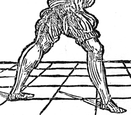 The position of the feet and movement from one guard to another is very similar to that of modern fencing (as shown by the pictures). The fencer stands as profiled as possible, according to the use of one or two hands, with the forward foot pointing toward the enemy and the backward one oriented 60°-90° to the side (left for a right handed fencer); the legs are spaced a little apart and the heels are not on the same line, to give more steadiness, especially for lateral moves (see the picture).